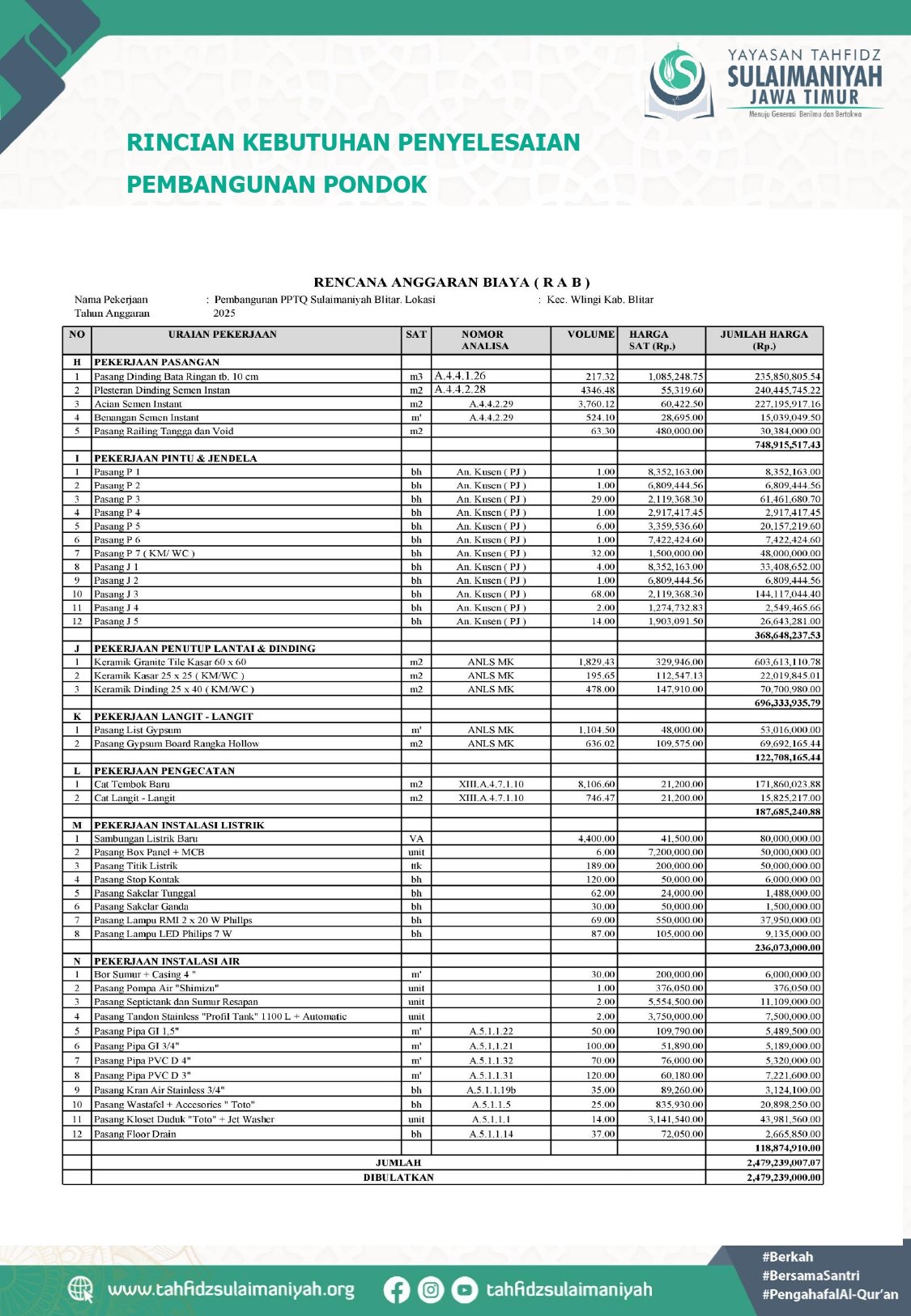 Program pembangunan ini dikelola oleh MPZ Sulaimaniyah Jawa Timur dan didukung oleh LAZNAS Saya Peduli sebagai lembaga resmi pengelola zakat, infak, dan sedekah. Seluruh donasi yang dihimpun dikelola secara amanah, transparan, dan sesuai syariat, serta disalurkan langsung untuk kebutuhan pembangunan berdasarkan progres lapangan.