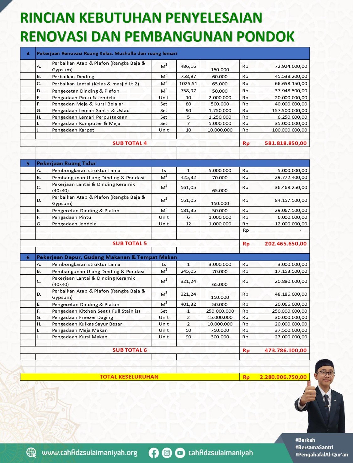 Saat ini, proses pembangunan pesantren masih berjalan. Beberapa ruang kelas, asrama santri, serta fasilitas penunjang belum dapat digunakan secara optimal karena keterbatasan dana. Padahal, pesantren-pesantren ini disiapkan sebagai tempat lahirnya generasi penghafal Al-Qur’an yang berakhlak, mandiri, dan bermanfaat bagi umat.