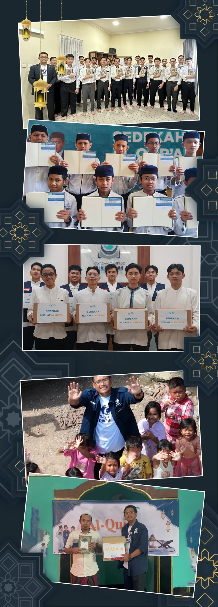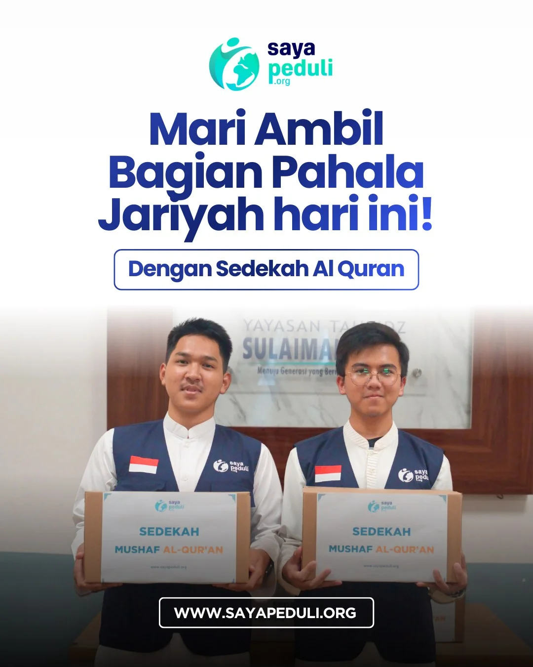 Melalui Program Sedekah Mushaf Al-Qur’an, LAZNAS Saya Peduli mengajak masyarakat untuk menghadiahkan mushaf Al-Qur’an sebagai amal jariyah yang pahalanya terus mengalir selama mushaf tersebut dibaca, dihafalkan, dan diamalkan.